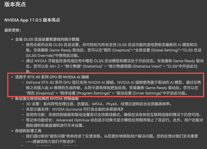 这一点是很多手持老显卡用户比较容易忽略的,每当驱动弹出有可用升级时,大家可详细看一下版本亮点中所提到的改进,如上图中的RTX 40系AI插帧功能,则建议更新驱动。如果是些无关紧要的事项,升级与否就取决于用户本身了。